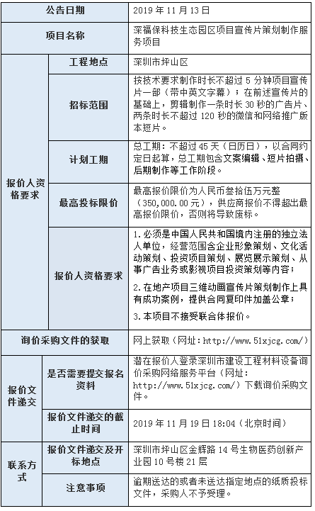 678体育科技生态园区项目宣传片策划制作服务项目(项目名称)采购方(采购人)为深圳市大工业区(深圳出口加工区)开发管理集团有限公司(采购人单位名称),采购资金来自企业自筹(资金来源),项目出资比例为100%。项目已具备采购条件,现进行公开询价采购。