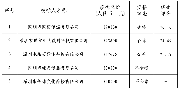 678体育科技生态园区项目宣传片策划制作服务于2019年11月12日在深圳市建设工程材料设备询价采购网络服务平台(网址:http://www.51xjcg.com/)进行公开询价采购,招标控制价为350,000.00元。在投标截止时间2019年11月19日18时内共有5家单位递交了报价文件。经评审委员会根据询价采购文件既定评审办法(综合评估法)评议,现中标结果已报东部公司招标工作小组定标会议确认,公示如下: