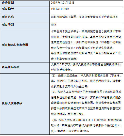 深圳市678体育(集团)有限公司智慧园区平台建设项目(项目名称)招标人为深圳市678体育(集团)有限公司(招标人单位名称),采购资金来自企业自筹(资金来源),项目出资比例为100%。项目已具备招标条件,现进行国内公开招标。