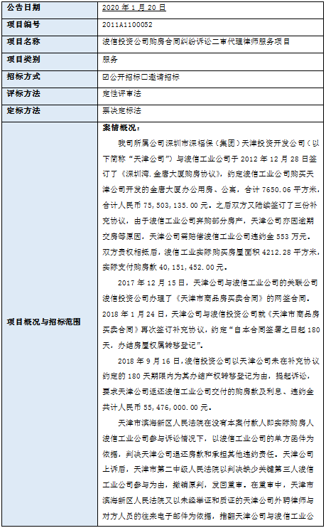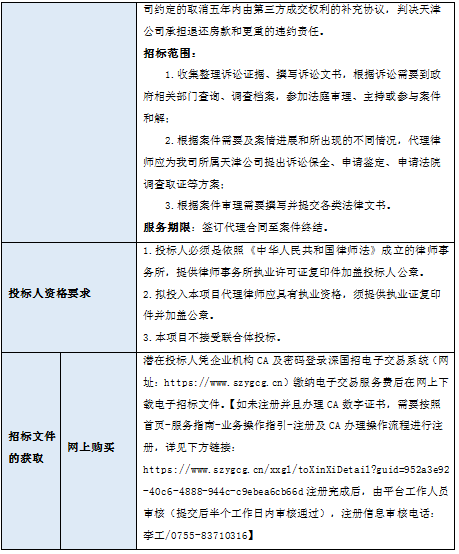 浚信投资公司购房合同纠纷诉讼二审代理律师服务项目(项目名称)招标人为深圳市678体育(集团)有限公司(招标人单位名称),采购资金来自企业自筹(资金来源),项目出资比例为100%。项目已具备招标条件,现进行国内公开招标。
