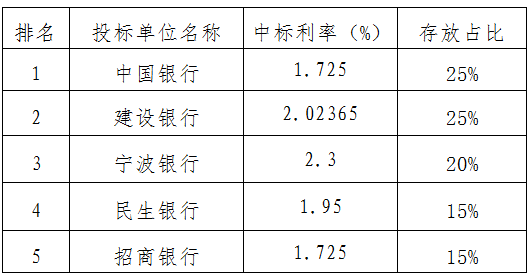 竞争性选择资金存放银行项目于2020年3月16日上午通过电子邮件方式向集团合作的14家银行发送了招标邀请书及招标文件,招标控制价为所有银行的报价利率(协定存款、通知存款、定期存款)不得低于中国人民银行协定存款基准利率1.15%。截至投标截止时间2020年3月20日下午2:30,共12家银行按时递交了投标文件,其中中信银行未能通过符合性检查。评标委员会根据招标文件既定评标办法(综合评估法)进行评审,中标结果已报集团办公会审议确认,中标人、中标利率及资金存放比例如下: