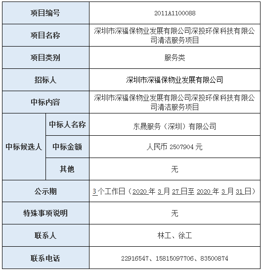 经深圳市国际招标有限公司组织招标的深圳市678体育物业发展有限公司深投环保科技有限公司清洁服务项目已完成评审,现将本项目评审的相关情况及结果进行公示,具体内容如下: