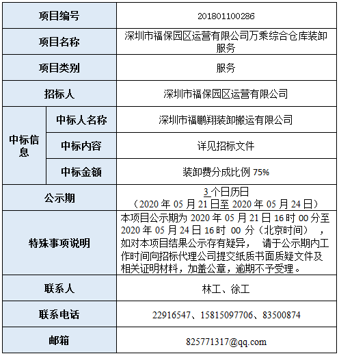 经深圳市国际招标有限公司组织招标的深圳市福保园区运营有限公司万乘综合仓库装卸服务已完成评审,现将本项目评审的相关情况及结果进行公示,具体内容如下: