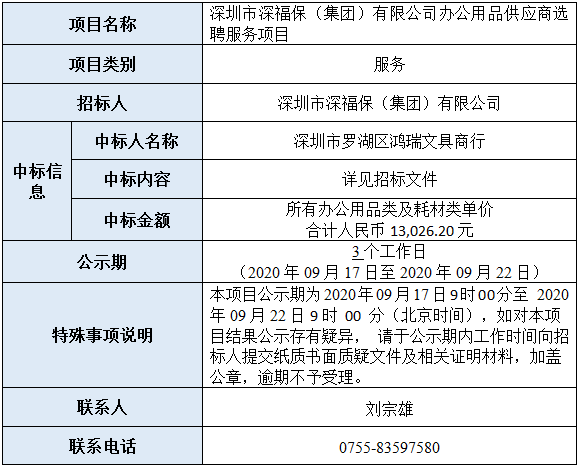 深圳市678体育(集团)有限公司办公用品供应商选聘服务项目已完成评审,现将本项目评审的相关情况及结果进行公示,具体内容如下: