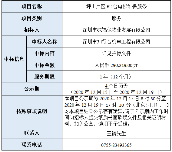 坪山片区62台电梯维保服务(深圳询价采购平台招标编号:SZXJCG-S202011180007)已完成评审,现将本项目评审的相关情况及结果进行公示,具体内容如下: