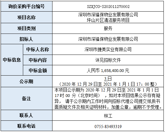 深圳市678体育物业发展有限公司坪山片区清洁服务项目中标结果公示