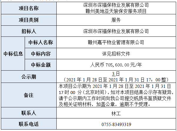 深圳市678体育物业发展有限公司赣州美地亚天骏保安服务项目中标结果公示