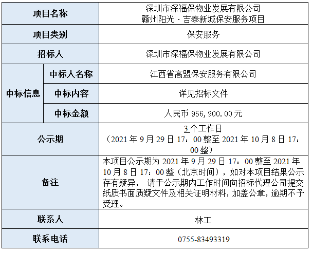 深圳市678体育物业发展有限公司赣州阳光·吉泰新城保安服务项目已完成评审,现将本项目评审的相关情况及结果进行公示,具体内容如下: