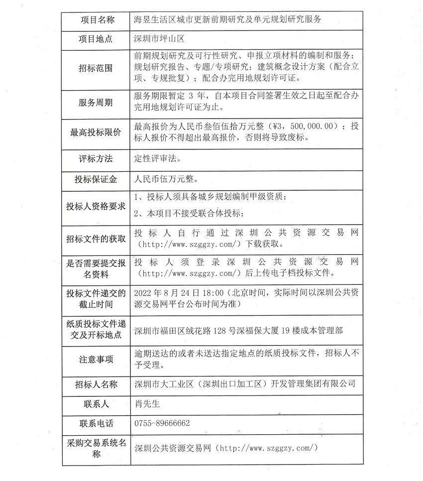 海昱生活区城市更新前期研究及单元规划研究服务采购(项目名称)的采购方为深圳市大工业区(深圳出口加工区)开发管理集团有限公司,采购资金来自企业自筹。目前项目已具备采购条件,现进行公开招标,欢迎符合资质并有意向的供应商投标报价,有关主要事项如下: