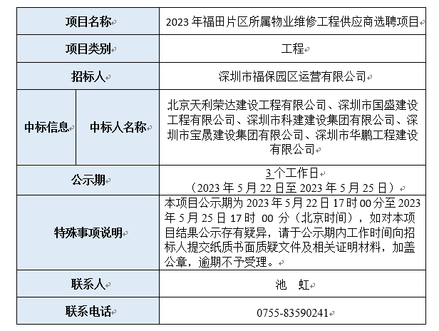 2023年福田片区所属物业维修工程供应商选聘项目中标公示