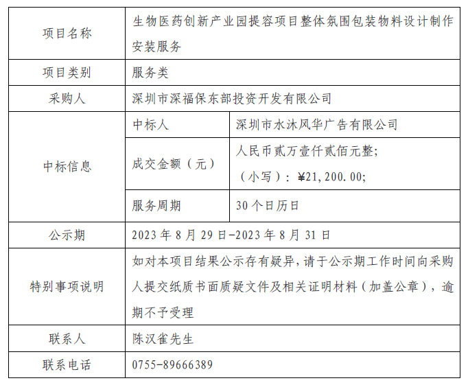 在深圳市建设工程材料设备询价采购平台进行公开招标的生物医药创新产业园提容项目整体氛围包装物料设计制作安装服务(项目编号:SZXJCG-S202308020010)已完成评审及定标,现将本项目评审的相关情况及中标结果进行公示,具体内容如下: