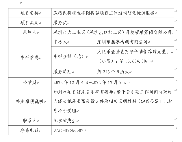 在深圳阳光采购平台进行公开招标的678体育科技生态园提容项目主体结构质量检测服务已完成评审及定标,现将本项目评审的相关情况及定标结果进行公示,具体内容如下:
