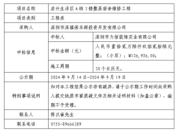 在深圳阳光采购平台进行公开招标的启兴生活区A栋3楼整层宿舍维修工程已完成评审及定标,现将本工程评审的相关情况及定标结果进行公示,具体内容如下: