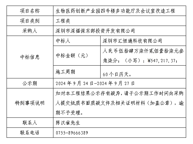 在深圳阳光采购平台进行公开招标的生物医药创新产业园四号楼多功能厅及会议室改造工程已完成评审及定标,现将本工程评审的相关情况及定标结果进行公示,具体内容如下: