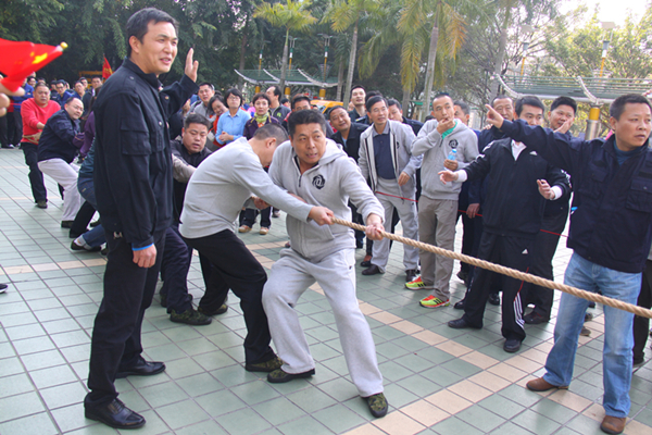 朱裁判一声哨响,比赛正式开始,现场气氛异常热烈。参赛队员们个个精神抖擞、使出全身的劲,紧紧抓牢手中的大绳,齐心协力往后拉,往后拔,往后拽……比赛涌现出一个又一个高潮,大家的呐喊声、鼓掌声、口号声交织成一片!啦啦队在场外高声有节奏的喊着“1,2,加油!”震耳欲聋的声音此起彼伏,给足了队员们信心,在这紧张时刻,他们咬紧牙关,使尽全力,奋勇拼搏。有的队员手和脸都拉得通红,有的身体倾斜就快躺到地上去了,可是仍然咬紧牙根坚持着,丝毫不松手。一场失利了,不要紧,下场继续,定要赢回来!每一个队伍、每一位队员都全力以赴,赛出了顽强的精神、团结的风尚!场场比赛牵动着全场员工的心,不分领导还是普通员工纷纷在旁边加油助威,呐喊声中,大家的心融为一体。经过激烈的四轮角逐,保安公司最终力压群雄,夺得了比赛冠军,坪山分公司、水电公司分别荣获亚、季军。