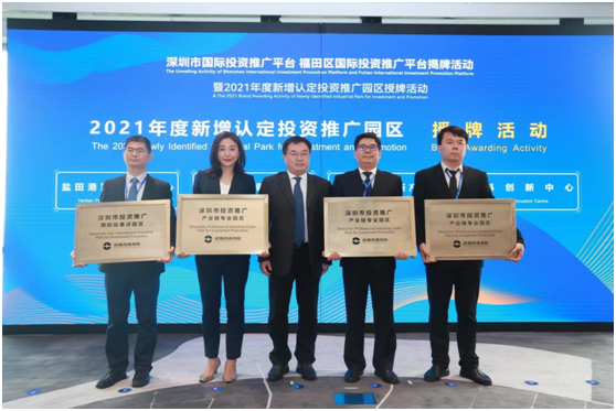5月26日下午,在深圳市商务局、福田区人民政府共同指导下,深圳市国际投资推广联合会在深圳城市云客厅举办“深圳市国际投资推广平台揭牌暨2021年度新增认定投资推广园区授牌仪式”。大会对一批产业链、国际化重点优质园区进行了授牌表彰,以期进一步加强全市投资推广园区建设,提升重点产业园区的国内外知名度、影响力及营运水平,加快招商引资重大项目落地,推动深圳市投资推广、招商引资工作再上新台阶。深圳市生物医药创新产业园区成功获得“深圳市投资推广产业链专业园区”荣誉称号,成为2021年市商务局授牌的4家产业链专业园区之一。