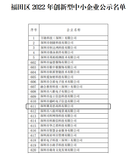 近日,深圳市福田区工业和信息化局发布了2022年市级创新型中小企业名单,678体育-启迪深港硬科技创新中心入驻企业深圳赛美思高科有限公司通过“福田区2022年创新型中小企业”评价认定。