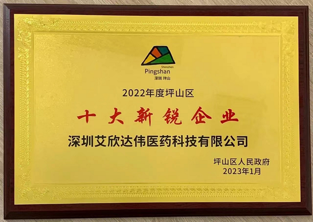 “十大新锐企业”荣誉称号(4家):科睿驰(深圳)医疗科技发展有限公司、深圳艾欣达伟医药科技有限公司、深圳普瑞金生物药业股份有限公司、深圳晶蛋生物医药科技有限公司;